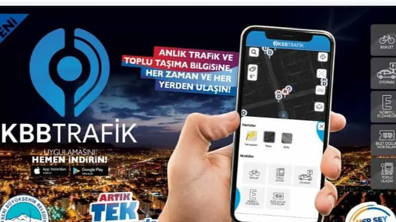 Kayseri Büyükşehir Belediyesi Ulaşım Planlama ve Raylı Sistem Daire Başkanlığı, ‘KBBTRAFİK’ adlı cep telefonu uygulaması ile Kayseri’deki merkez ve kırsal bütün ulaşım dâhilindeki durak ile toplu ulaşım araçlarının bilgisini cep telefonlarına sığdırdı.