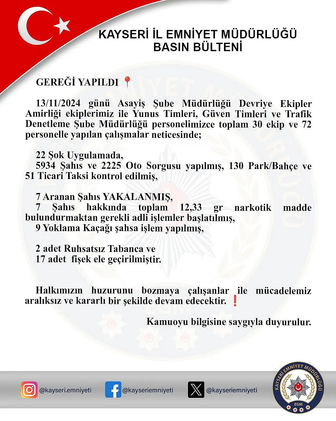 Kayseri İl Emniyet Müdürlüğü Asayiş Şube Müdürlüğü Devriye Ekipler Amirliği ekipleri, Yunus Timleri, Güven Timleri ve Trafik Denetleme Şube Müdürlüğünce 30 ekip ve 72 personelle 22 şok uygulama gerçekleştirildi. Yapılan çalışmalar neticesinde 5 bin 934 kişi ve 2 bin 225 araç sorgulandı, 130 park, bahçe ve 78 ticari taksi kontrol edildi. Ayrıca aranan şahıslara yönelik 7 kişi, 12,33 gram narkotik madde bulundurmaktan 7 kişi, yoklama kaçağı olan 9 kişi toplamda 23 kişi hakkında adli işlem başlatıldı.