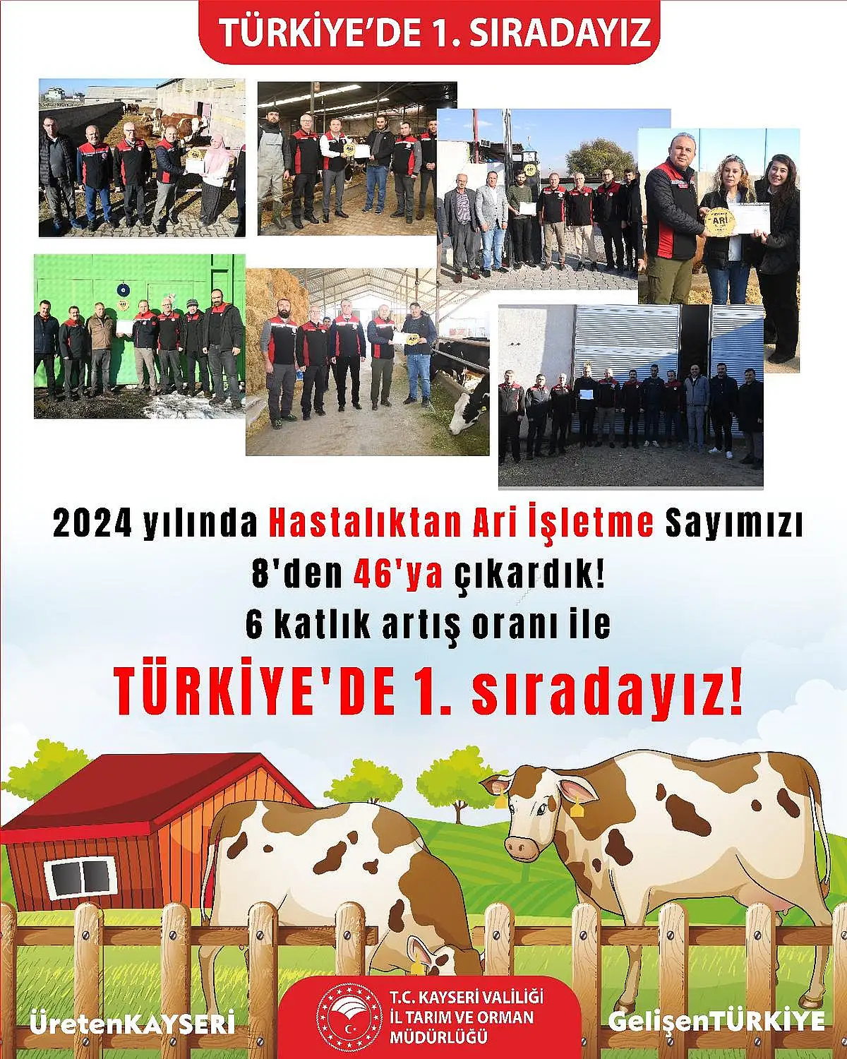 Tarım ve Orman Bakanlığı tarafından, ülkemizde görülen sığır tüberkülozu ve sığır brucellozu hastalıkları ile etkin mücadele edilebilmesi, sürdürülebilir hayvancılığın sağlanması ve halk sağlığının korunması amacıyla ‘Hastalıktan Ari İşletmelerin Desteklenmesi Projesi’ uygulanıyor. Kayseri’de de Tarım ve Orman İl Müdürlüğü 2024 yılında hastalıktan ari işletme sayısının 8’den 46’ya çıktığını duyurdu. İşletme sayısı 6 kat artış göstererek Türkiye’de 1’inci sıraya yerleşti.