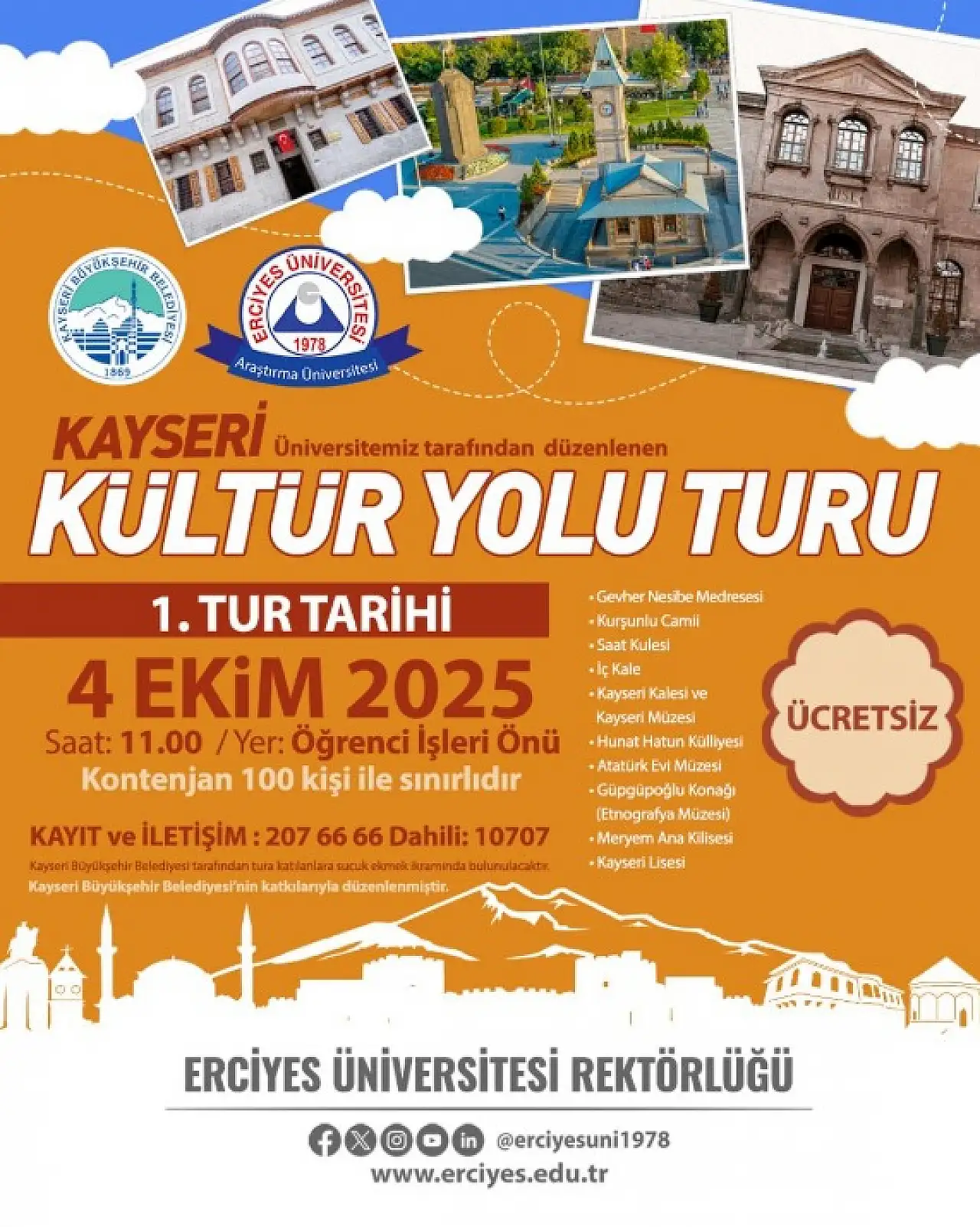 Erciyes Üniversitesi tarafından düzenlenen Kayseri Kültür Yolu Turları başlıyor. Ücretsiz olarak düzenlenen tur da öğrenciler kentin turizm noktalarını ziyaret edecek.