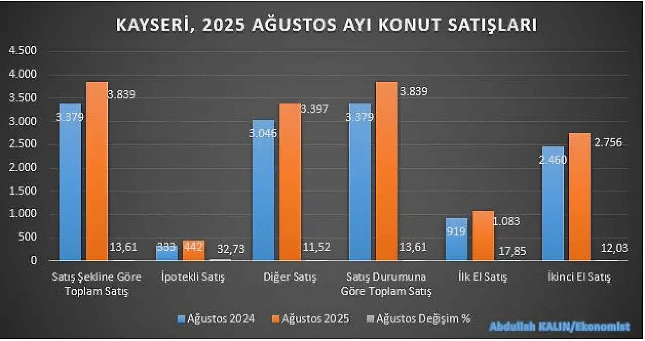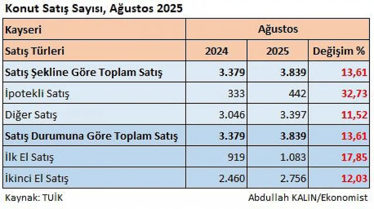 Türkiye İstatistik Kurumu verilerine göre Kayseri’de ise ağustos ayında bir önceki yılın aynı ayına göre yüzde 13,61 artış göstererek 3 bin 839 oldu. Bu rakam ağustos ayı satışlarında son 10 yılın zirvesi olarak kaydedildi. Kayseri’de ipotekli konut satışları ağustos ayında bir önceki yılın aynı ayına göre yüzde 32,73 artış göstererek 442 oldu. Kayseri’de diğer konut satışları ağustos ayında bir önceki yılın aynı ayına göre yüzde 11,52 aratarak 3 bin 397 oldu.