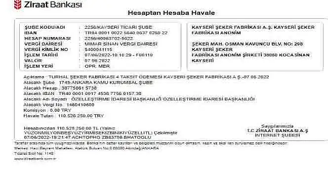 Kayseri Şeker, Turhal Şeker Fabrikası'nın son ödeme taksiti ile ilgili yaptığı açıklamada son taksit ödemesinin yapıldığına dair banka dekontu paylaşıldı.Yapılan açıklamada özelleşecek 4.