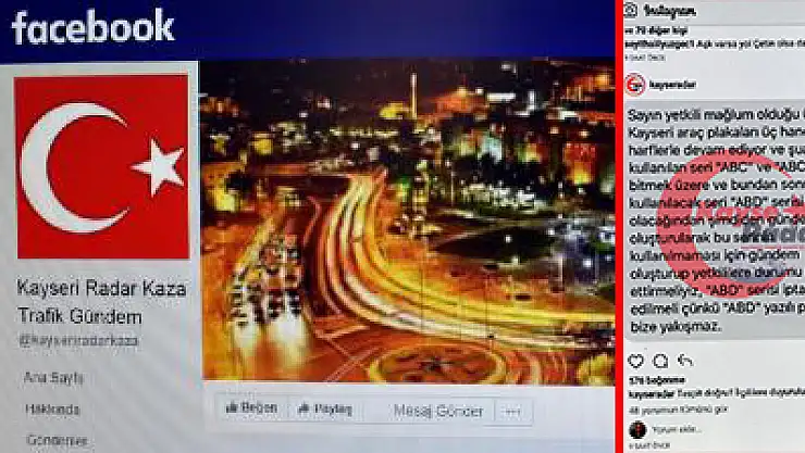 Son dönemde yaşanan gelişmeler nedeniyle ilişkilerin gerginleştiği ABD'ye Kayserili vatandaşlardan ilginç bir tepki geldi. Sosyal medyada trafikle ilgili paylaşımlar yapan Kayseri Radar grubu üyeleri, kentte yakın zamanda kullanılmasına başlanacak 'ABD' harf grubu serili araç plakalarının iptali çağrısında bulundu. Yapılan paylaşımda, "Malum olduğu üzere, Kayseri'de araç plakaları 3 haneye geçti. Şu anda 3 harf uygulamasında ABC serisi bitmek üzere. Bundan sonra kullanılacak seri, ABD serisi olacak, şimdiden gündem oluşturularak, bu serinin kullanılmaması için yetkililere durumu fark ettirmeliyiz. ABD serisi iptal edilmelidir. Çünkü ABD yazılı plaka bize yakışmaz' ifadeleri kullanıldı. Paylaşım çok sayıda beğeni ve yorum aldı.