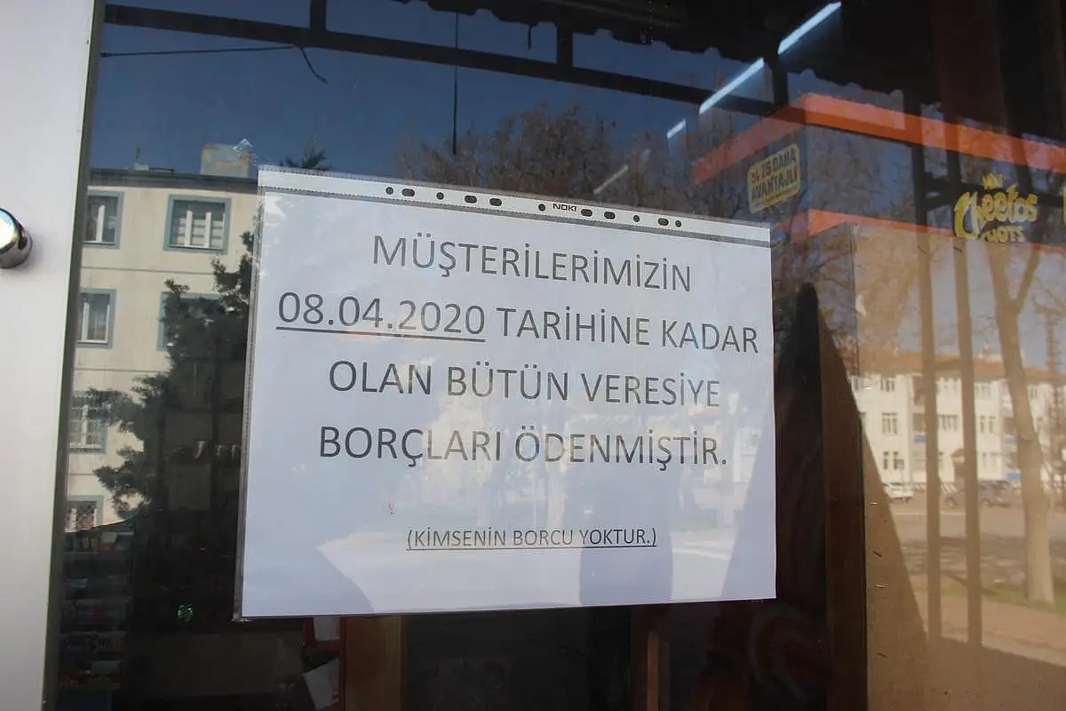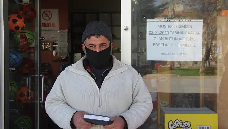 Kayseri'nin Melikgazi ilçesinde geçtiğimiz günlerde bir bakkala gelen hayırsever, veresiye defterindeki borçları ödemek istediğini söyledi. Bakkal sahibi Fatih Coşkun, gelen talep üzerine neye uğradığını şaşırarak, hayırseveri tanımak istedi. Kimliğini gizleyen hayırsever, veresiye defterindeki borçları kapattıktan sonra sırra kadem bastı. Bakkal sahibi Coşkun da, bu kararı bakkalının camına yazdığı 'Müşterilerimizin 08.04.2020 tarihine kadar olan bütün veresiye borçları ödenmiştir. Kimsenin borcu yoktur' yazılı döviz asarak, müjdeli haberi mahalle sakinleri ile paylaştı.