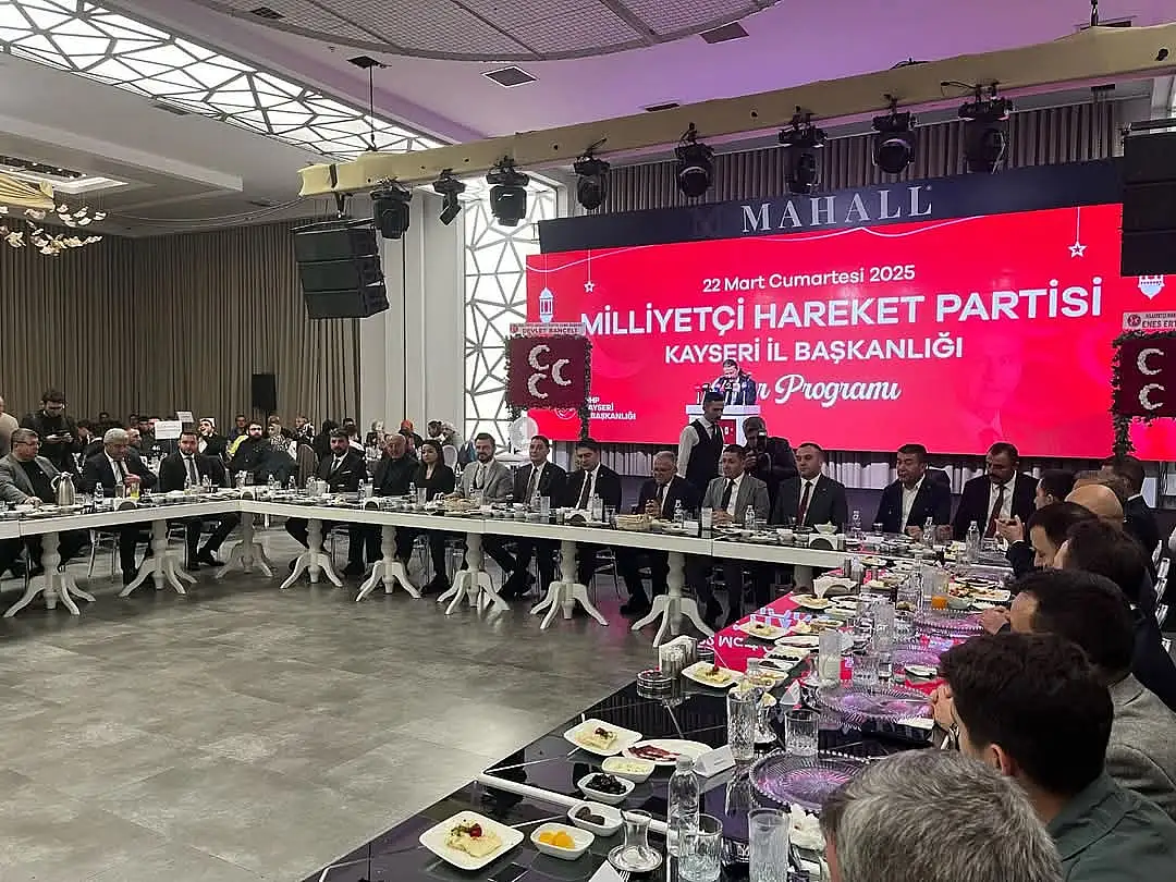 Milliyetçi Hareket Partisi Kayseri İl Başkanlığı tarafından bir düğün salonunda yoğun katılımın olduğu iftar programı düzenlendi. İl Başkanı Enes Ertuğrul Kalın'ın organizasyonunda gerçekleşen programda Milliyetçi Hareket Partisi’nin terörsüz Türkiye kapsamında yeni hedef ve vizyonu anlatılırken barış ikliminin tesis edileceği belirtildi. Genel Başkan Yardımcısı ve Kayseri Milletvekili İsmail Özdemir, CHP'nin sokağa çıkma çağrısı ile ilgili, “Cumhuriyet Halk Partisi'nin acemi, sevimsiz genel başkanı Özgür Özel, bunu demek yerine hala anayasaya karşı suç işleyecek tarzda sorumsuz bir anlayışla hem partisini hem de Türkiye'nin geri kalanını huzursuzluk içine çekecek bir tutum takılmaktadır. Bunun kabulü mümkün değildir. Bu şartlar altında Cumhuriyet Halk Partisi, anayasaya aykırı fiillerin odağı haline geldiği gerçeği karşınızda bulunuyor. Gidişat, kendileri açısından doğru değildir. Özgür Özel, bu millete kafa tutma, hukuka hiç kafa tutma, millete gaz verme” dedi.