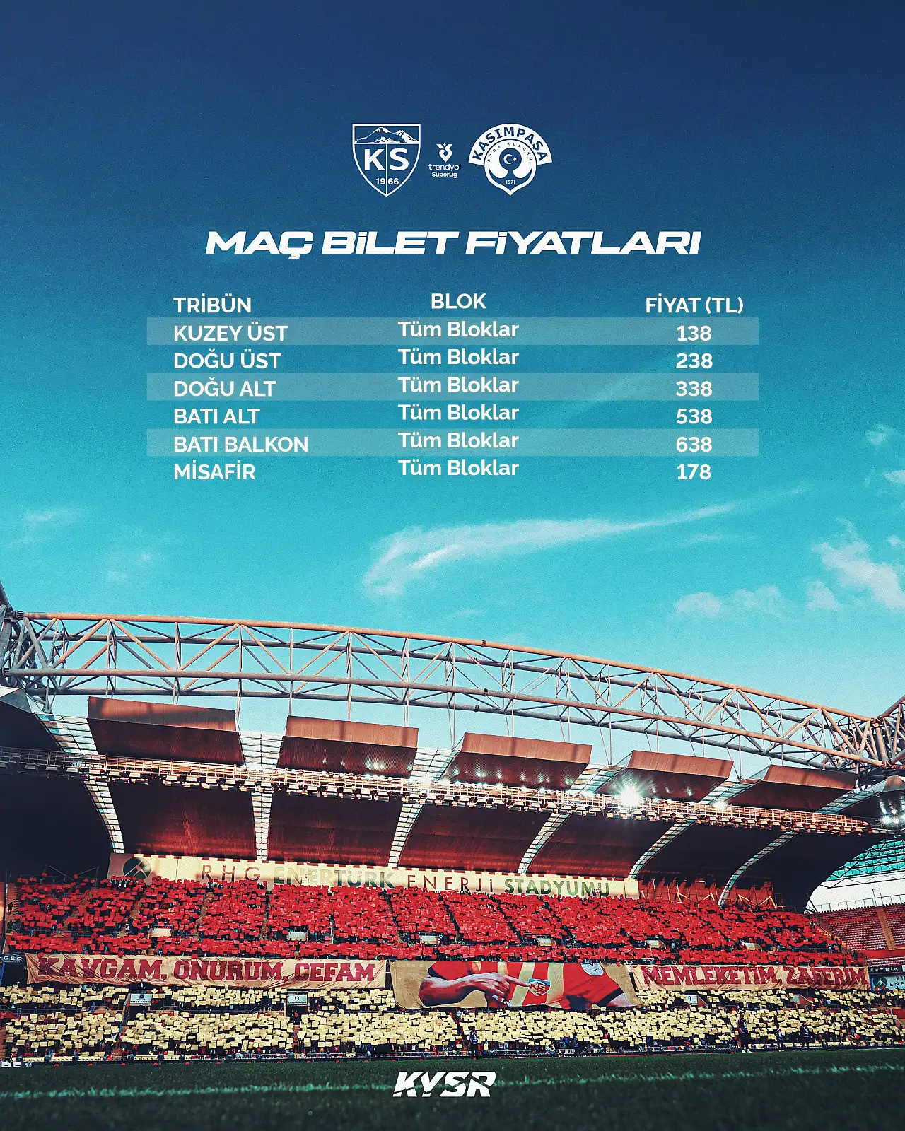 Kayserispor–Kasımpaşa maçı biletleri yarın satışta