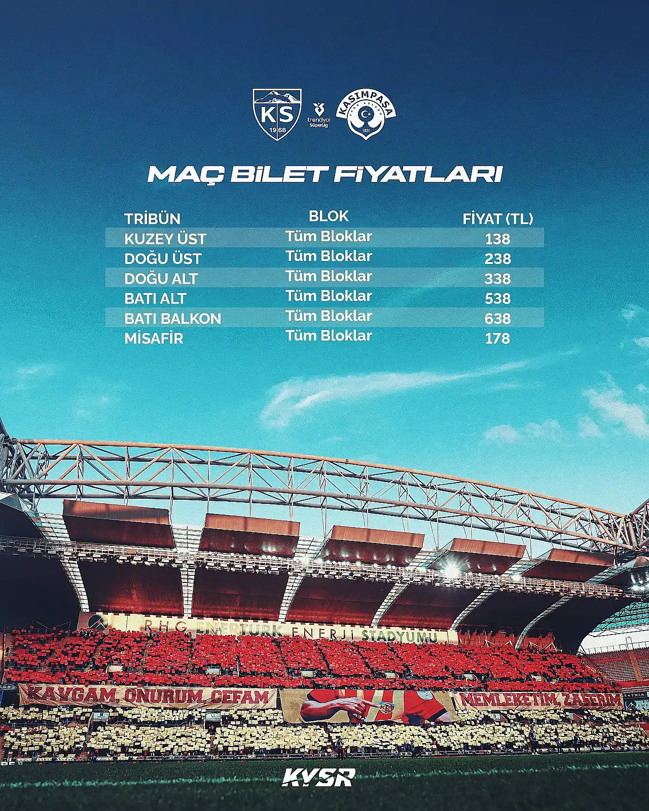 Trendyol Süper Lig 2025-2026 Sezonu 11. hafta mücadelesinde Kayserispor, Kasımpaşa'yı RHG Enertürk Enerji Stadyumu'nda ağırlayacak. Bu maçın biletleri bugün itibarıyla satışa sunuldu.