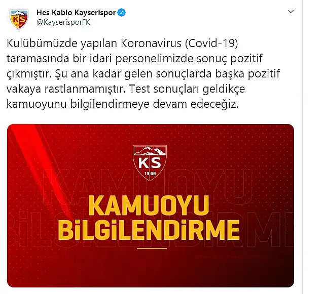 Korona virüse karşı önlemler arttırılırken, spor kulüpleri de idari personeli ve futbolcuları teste tabii tutuyor. Kayserispor'da gerçekleştirilen testlerin ardından bir teknik personelin testinin pozitif çıktığı açıklaması yapıldı. Kulübün sosyal medya hesabından yaptığı açıklamada: "Kulübümüzde yapılan Koronavirus (Covid-19) taramasında bir idari personelimizde sonuç pozitif çıkmıştır. Şu ana kadar gelen sonuçlarda başka pozitif vakaya rastlanmamıştır. Test sonuçları geldikçe kamuoyunu bilgilendirmeye devam edeceğiz" ifadelerine yer verildi.