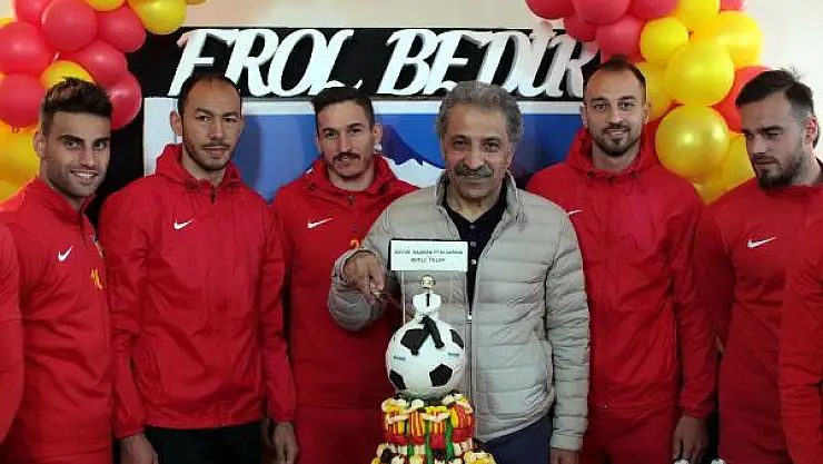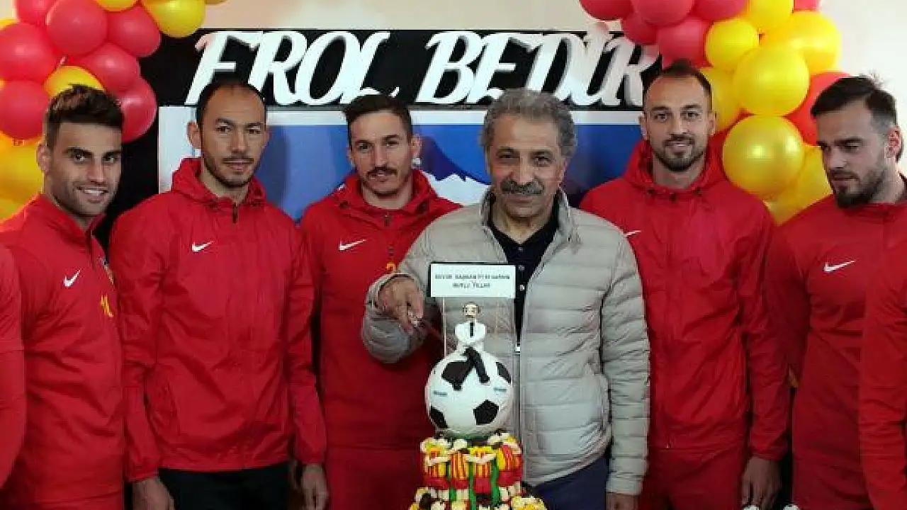 Kayserisporlu futbolcular 60'ncı yaş gününde başkan Erol Bedir'e ilginç bir pasta ile süpriz yaptı.Bir futbol topu üzerinde başkan Bedir ile birbirine kenetlenmiş sarı-kırmızılı oyuncuları gösteren 2 katlı pastayı oyuncuların ve yöneticilerin alkışları ar