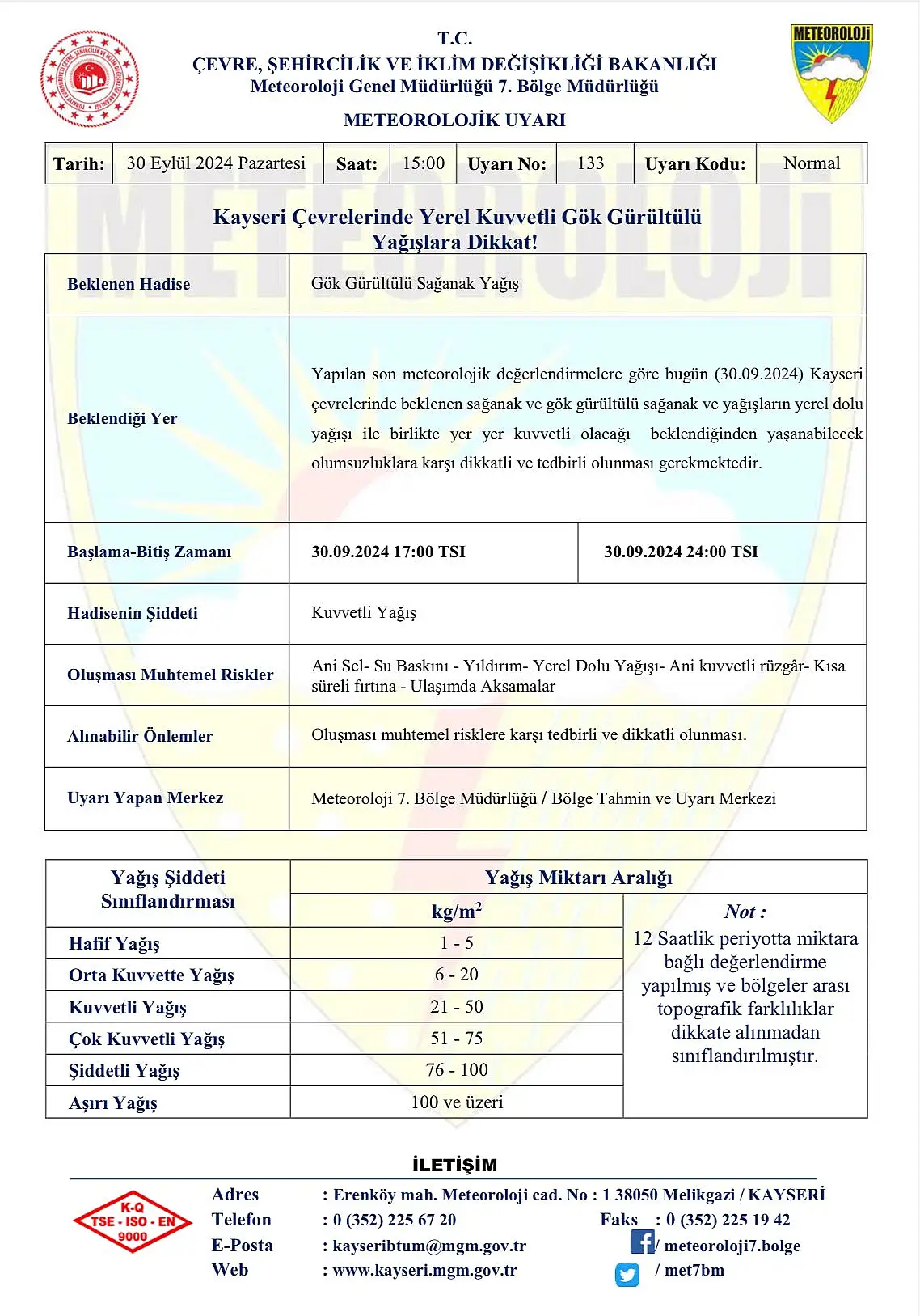 Yapılan açıklamada, “Yapılan son meteorolojik değerlendirmelere göre bugün (30.09.2024) Kayseri çevrelerinde beklenen sağanak ve gök gürültülü sağanak ve yağışların yerel dolu yağışı ile birlikte yer yer kuvvetli olacağı beklendiğinden yaşanabilecek olumsuzluklara karşı dikkatli ve tedbirli olunması gerekmektedir. Bu kapsamda; vatandaşlarımızın ani sel, su baskını, yıldırım, yerel dolu yağışı, ani kuvvetli rüzgar ve ulaşımda aksamalar gibi olumsuzluklara karşı dikkatli ve tedbirli olmaları gerekmektedir” denildi.