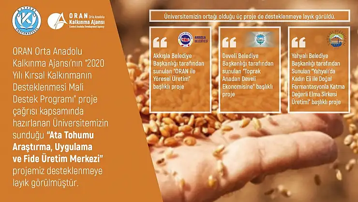 Kayseri Üniversitesi tarafından kırsal kalkınmaya destek amacıyla hazırlanan projeler arasındaki 'Ata Tohumu Araştırma, Uygulama ve Fide Üretim Merkezi Projesine', ORAN Orta Anadolu Kalkınma Ajansından destek geldi.ORAN Orta Anadolu Kalkınma Ajansı'nın 20