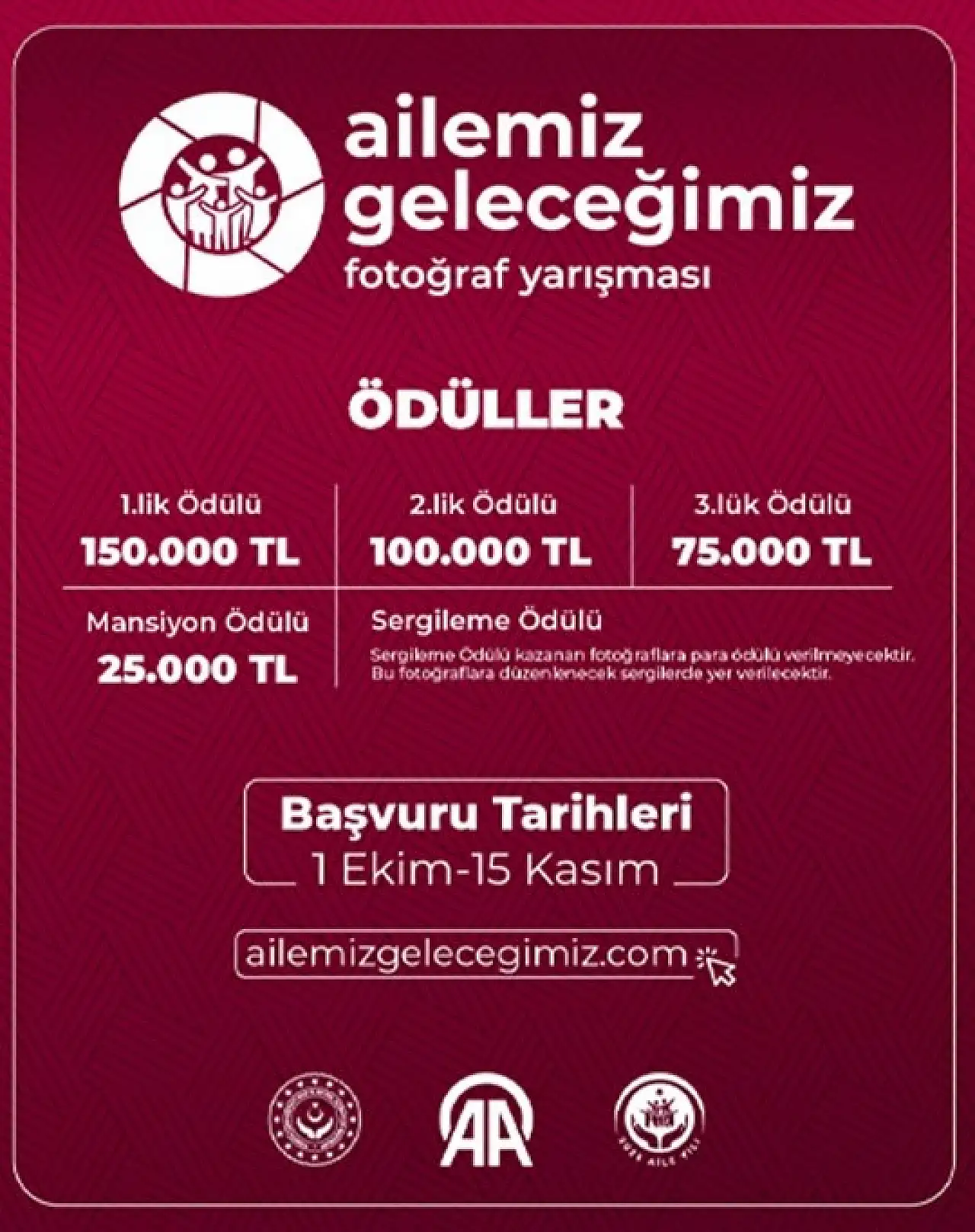 Aile ve Sosyal Hizmetler Bakanlığı tarafından 2025 Aile Yılı kapsamında farkındalık oluşturmak adına 'Ailemiz Geleceğimiz Fotoğraf Yarışması' düzenleniyor. Yarışmaya başvurular ise bugün başladı, 15 Kasım'a kadar sürecek ve 'ailemizgelecegimiz.com' adresi üzerinden yapılabilecek. Yarışmanın birincisine ise 150 bin lira ödül verilecek.