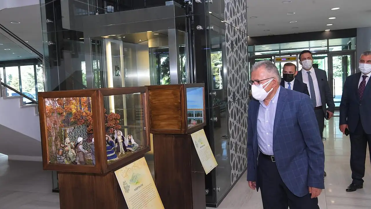 Kayseri Büyükşehir Belediye Başkanı Dr.Memduh Büyükkılıç, belediye fuaye alanında açılan İran'ın İsfahan'dan Kayseri Erciyes'e uzanan Kerem ile Aslı'nın hüzünlü ve çok az bilinen sevda hikâyesinin yer aldığı minyatür sergiyi gezdi.