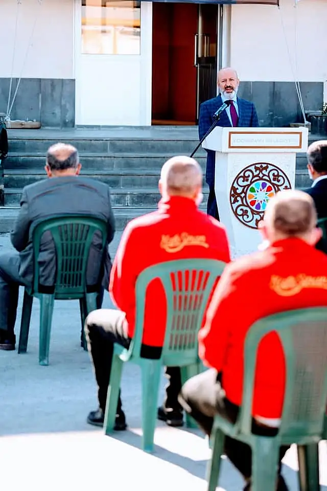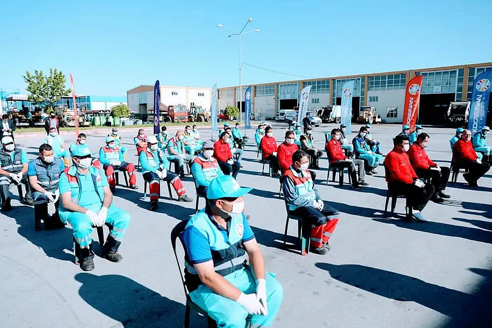 Başkan Çolakbayrakdar, Kocasinan Belediyesi Atölyesinde Makine İkmal, Temizlik, Fen İşleri, Veterinerlik ve Park-Bahçeler Müdürlüğü personeliyle sosyal mesafe kuralına uygun olarak, gönül selamıyla bayramlaştı. Gece gündüz demeden Kocasinan sakinlerine hizmet götürmek için durmaksızın çalıştıklarını belirten Başkan Çolakbayrakdar, “Rabbim, sağlık ve sıhhat içerisinde nice bayramlara erişmeyi nasip eylesin. 11 Mart’tan sonra yaşantımızda değişiklikler başladı ve bundan sonra da buna uygun olarak yaşam şeklimizi oluşturuyoruz. İnşallah en kısa zamanda daha önceki gündelik hayatımızda yaptığımız rutin faaliyetlere dönmüş oluruz. Bu bayram geçmiş bayramlardan farklı bayram oldu ama bugünler de inşallah geçecek. Bu süreç içerisinde özverili çalışan belediye personeline teşekkür ediyorum. Allah kolaylıklar versin. Bu süreçte birçok farklı kuruluşlar yoğun gayret gösterdi. Sağlık çalışanları başta olmak üzere insanların sağlığını kazanmaları noktasında yoğun gayret sarf ettiler. Bunun bir tarafından belediye çalışanları var. Kocasinan Belediyesi’nde olduğu gibi diğer belediye personeli de özverili çalışma içinde oldular. Bu noktada emeği geçen herkesi kutluyor ve teşekkür ediyorum. Hijyen ve temizlik çalışmalarının yanı sıra toplum sağlığıyla ilgili hizmetler gerçekleştirildi. Bu çerçevede personelimizin yaptığı çalışmalar, son derece önemli ve değerlidir. Özellikle Vefa Destek Grubunda çalışan kardeşlerimiz, toplumun ihtiyaçlarını gidermek için kamunun bütün imkanlarıyla gerekeni yaptılar. Rabbim, yeniden sağlık ve huzur içerisinde bayramlara erişmeyi nasip etsin” ifadelerini kullandı.