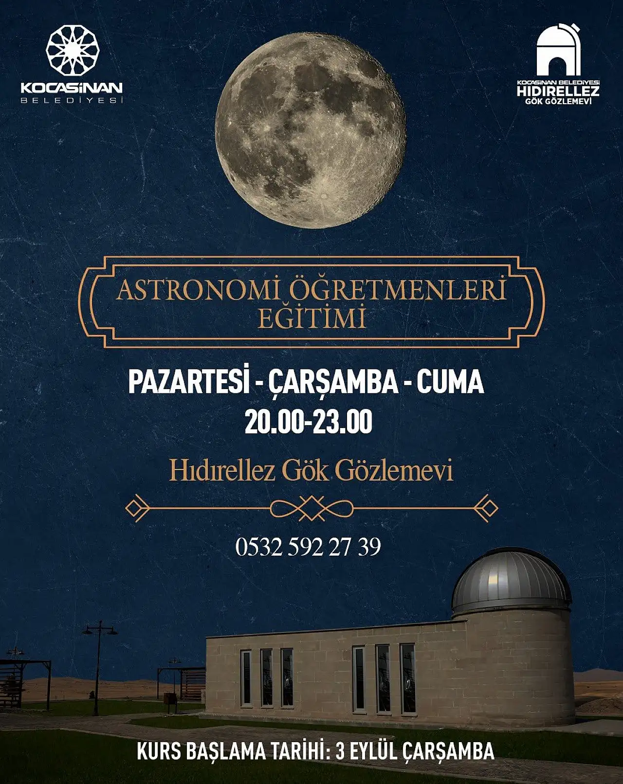 Kocasinan Belediyesi'nin hayata geçirdiği 'Astronomi Öğretmenleri Eğitimi' 3 Eylül Çarşamba günü Hıdırellez Gök Gözlemevi'nde başlıyor.