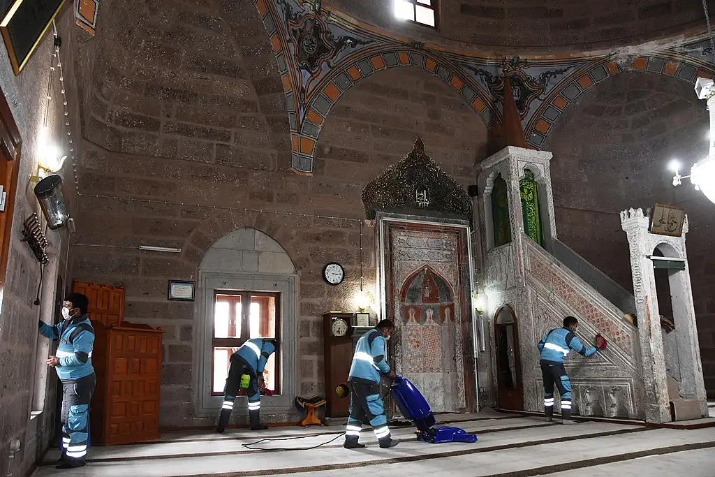 Kayseri’nin en eski yerleşim yerlerinden biri olan ve tarihi silueti yapılarla dikkat çeken Molu Mahallesi’ndeki Mimar Sinan yapımı Molu Cami’sini, Kocasinan Belediyesi Temizlik İşleri Müdürlüğü ekipleri tarafından teknolojik temizleme cihazlarıyla, camilerin dış temizliğinin yanında halı, kapı, cam, ahşap ve kitaplık gibi alanları hijyenik olarak temizleniyor.