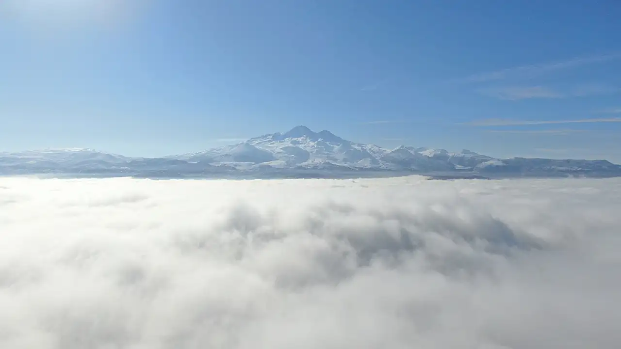 Kocasinan’da kış mevsimiyle birlikte kartpostallık görüntüler oluştu. Özellikle doğası ve kadim mahallelerin farklı özellikleriyle eşsiz bir seyir zevki sunan Kocasinan’da, bulutların üstünde kalan Erciyes’in kış güzelliği büyülüyor. Adeta saklı bir cenneti bünyesinde barındıran Erciyes, tabloları aratmayan manzaralarıyla dikkat çekiyor.