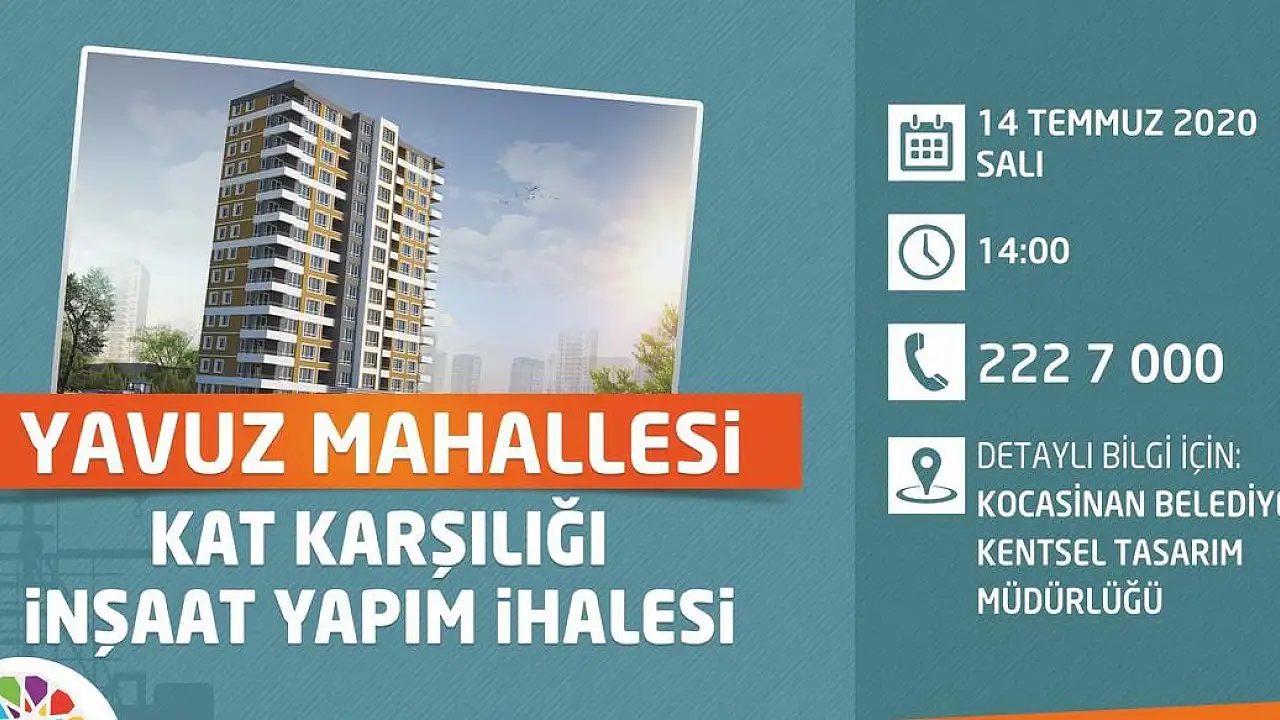 Yavuz Mahallesi’nde 1 blok 72 dairenin kat karşılığı ihalesinin 14 Temmuz Salı günü saat 14.00'de Encümen Salonu’nda başlayacağı hatırlatılan açıklamada; ihale şartname ve eklerinin Kentsel Tasarım Müdürlüğü'nden temin edinilebileceği Ayrıca 0352 222 70 00 numaralı telefondan ayrıntılı bilgi alınabileceği kaydedildi.