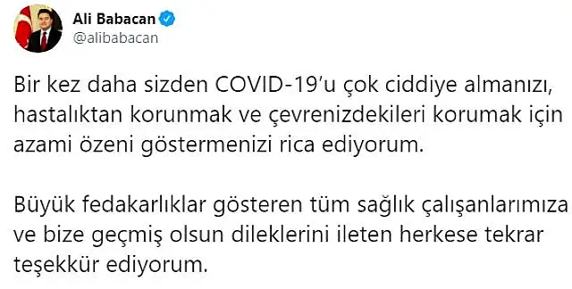 Ali Babacan, geçtiğimiz hafta koronavirüs olduğunu Twitter'dan duyurmuş, şu ifadelere yer vermişti: "Biraz önce COVID-19 testimin sonucunun pozitif olduğunu öğrendim. Şu an durumum iyi çok şükür. Doktorlarım bir süre ailemle birlikte karantina altında kalmam gerektiğini söyledi. Çalışmalarıma evden devam edeceğim inşallah."