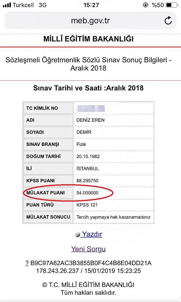 KPSS'de aldığı 88.295 puanla fizik öğretmenliği alanında Türkiye birincisi olan Deniz Eren Demir, mülakatta 54 puan alarak elendi.