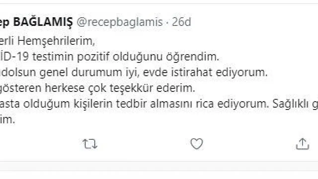 Sosyal medya hesabı paylaşımı yapan Başkan Bağlamış; "Değerli hemşehrilerim, COVİD-19 testimin pozitif olduğunu öğrendim. Hamt olsun genel durumum iyi, evde istirahat ediyorum. İlgi gösteren herkese çok teşekkür ederim. Temasta olduğum kişilerin tedbir almasını rica ediyorum. Sağlıklı günler dilerim" ifadelerine yer verdi.