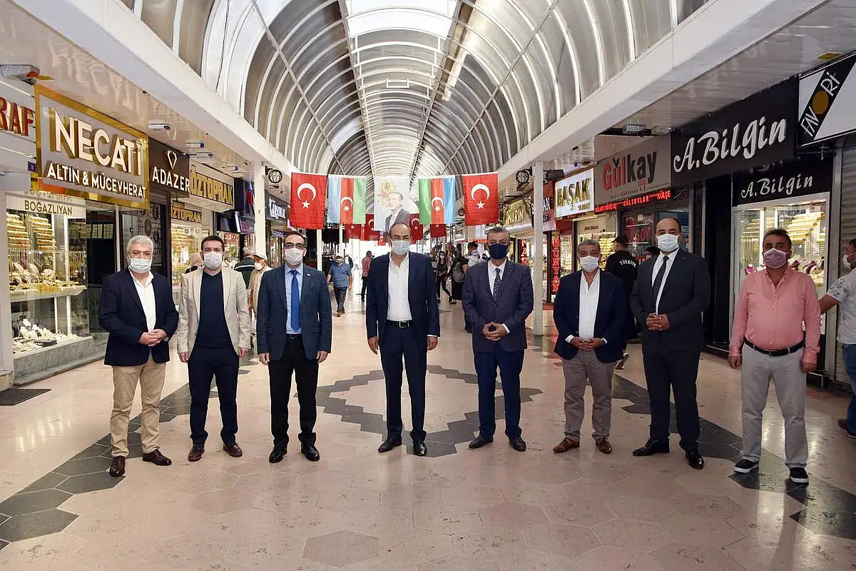 Kayseri Ticaret Odası (KTO) Yönetim Kurulu Başkanı Ömer Gülsoy, Koronavirüs tedbirleri kapsamında ticaretin kalbinin attığı yer olan Kazancılar Çarşısı’nda denetim yaptı. Aile ve Sosyal Politikalar İl Müdür Yardımcısı Cüneyd Özdemir, Kayseri Sarraf ve Kuyumcular Derneği Başkanı Adnan İncetoprak ile Yönetim Kurulu Üyeleri’nin de eşlik ettiği denetimde esnaflara hayırlı işler dileyen Başkan Gülsoy, maske, mesafe ve temizlik kurallarına uyulması konusunda hatırlatmalarda bulundu.