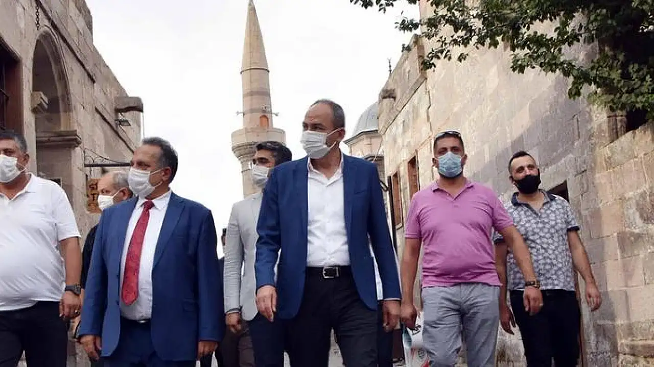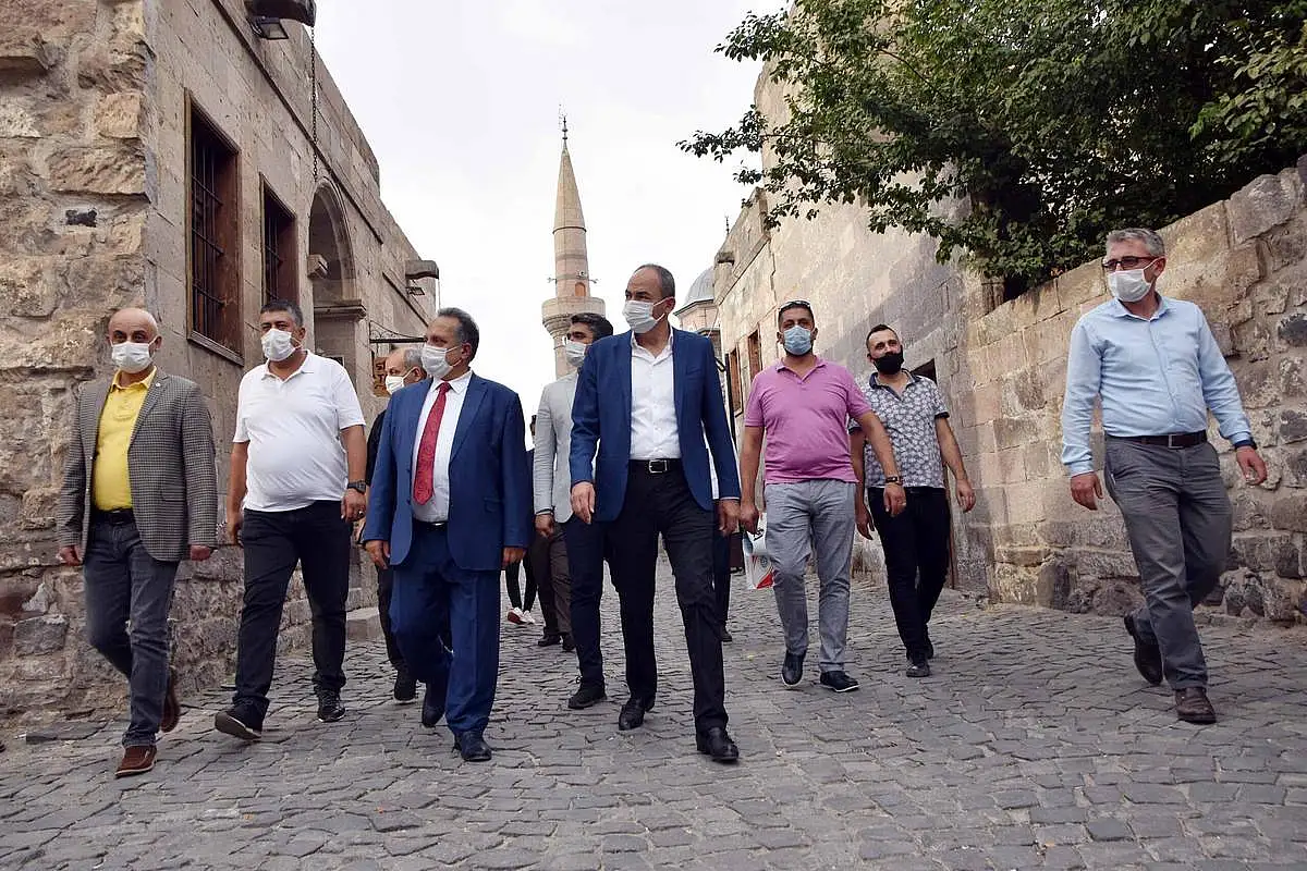 Sağlık Bakanı Fahrettin Koca’nın Kayseri’de salgının yükselişte olduğunu belirtmesi üzerine KTO Yönetimi de tedbirlerin artırılması yönünde üyelerini ziyaretlerini sıklaştırarak uyarılarda bulunuyor. Başkan Gülsoy ile Yönetim Kurulu Üyesi Ali Alkan, Talas İlçesindeki halkın keyifli vakit geçirdiği Taş evleri ve yeraltı şehirleriyle ünlü Ali Saip Paşa Sokağı'nı ziyaret etti. Talas Belediye Başkanı Mustafa Yalçın’ın da katıldığı ziyarette tarihi mekanda bulunan kafe, restorant, lokanta ile yeme-içme mekanlarının sahipleriyle istişare toplantısı yapıldı. Başkan Gülsoy ile Başkan Yalçın, işletme sahiplerinden korona virüs tedbirleri, maske, mesafe ve temizlik kurallarına uyulması konusunda daha duyarlı olmalarını istedi.