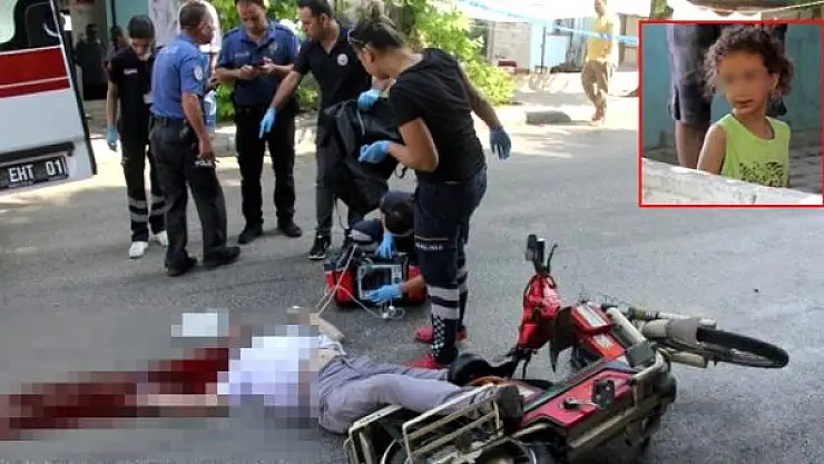 Adana'da, kimliği belirsiz bir kişi, kucağında 5 yaşında çocuğu bulunan mobilet üzerindeki adam ile kahvehanede oturan 2 kişiyi öldürdü. Mobilet üzerinde öldürülen şahsın kızının babasına son bakışı yürek burktu.