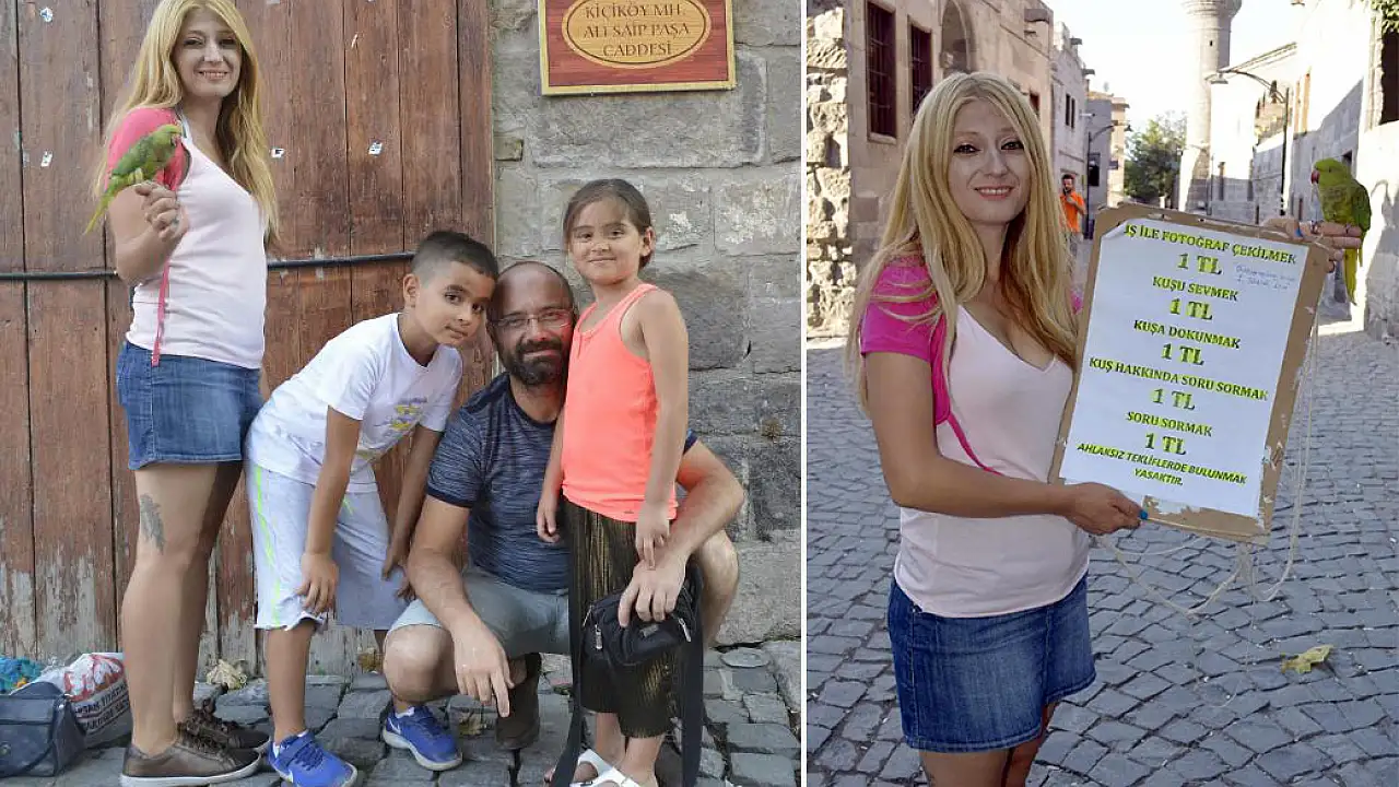KAYSERİ'nin Talas ilçesindeki evinde beslediği kuşlarını sokaklarda başının üstünde gezdirip, hayvanlarla ilgili soru soran ve fotoğraf çektirenden 1 lira alan Züleyha Yaman (32), zabıta ekiplerinin kendisine engel olmaya başladığını söyledi. Zabıta memuru ise ilçe sakinleri ile esnafın Yaman'dan rahatsız olduğunu belirtti.