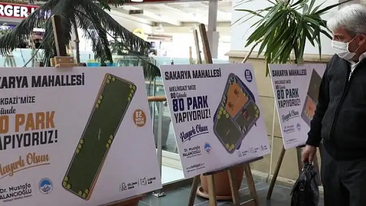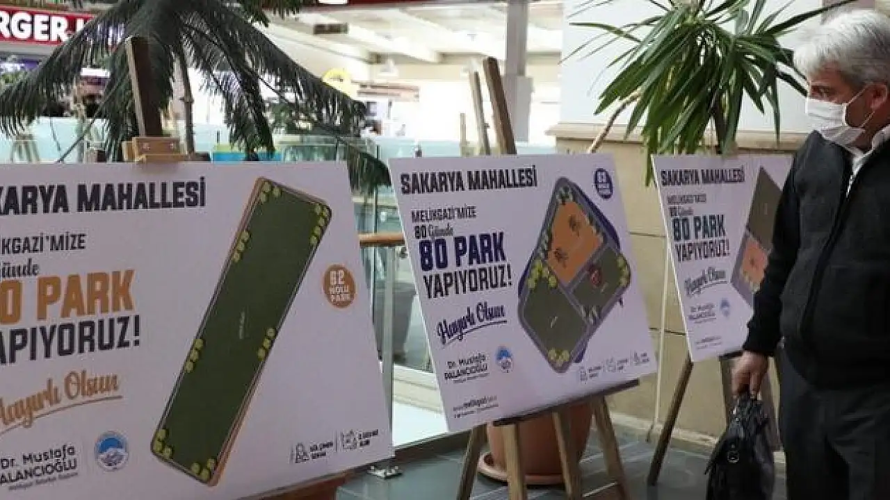 Melikgazi Belediye Başkanı Dr. Mustafa Palancıoğlu ilçede 80 günde 400 bin metrekare alanda 40 milyon liraya mal olacak 80 park yapacaklarını kaydederek, "80 günde 80 park projemizin sergisini bütün alışveriş merkezlerinde yaptık. Hafta sonu da Meysu Outlet Avm’de düzenlenen sergimize vatandaşlar ilgi gösterdi. Projemize yoğun ilgi gösteren ve beğenen hemşehrilerimizden aldığımız güçle en güzel parkları biz yapacağız. Parklarımızı ve içeriklerini merak eden vatandaşlarımız için sergi açtık. Parklarımızı merak eden vatandaşlarımızı Melikgazi Belediyesi fuaye alanında düzenlenen sergimize davet ediyorum. Parklarımızın yapımı tüm hızıyla devam ediyor. Mesai arkadaşlarım sağolsun çok emek veriyor, gayretle çalışıyorlar. Söz verdiğimiz gibi inşallah 80 gün sonra parklarımızı tamamlayacağız. Bu projemiz toplumun her kesimini kucaklayacak proje. Ve hepsinden önemlisi Melikgazi’mizin 58 mahallesine yapılıyor. Bu yeni parklarımıza 15 ila 30 yaş arası 25 bin tane büyük ağaçlarımızı dikeceğiz. 29 Aralık gününe kadar da tüm parklarımızı bitirmiş olacağız.” dedi.