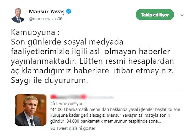 Bankamatik memurları hakkında yasal işlemler başlatıldığına dair iddialarına ilişkin açıklama yapan Ankara Büyükşehir Belediye Başkanı Mansur Yavaş, 'Resmi hesaplardan açıklamadığımız haberlere itibar etmeyiniz.' dedi.