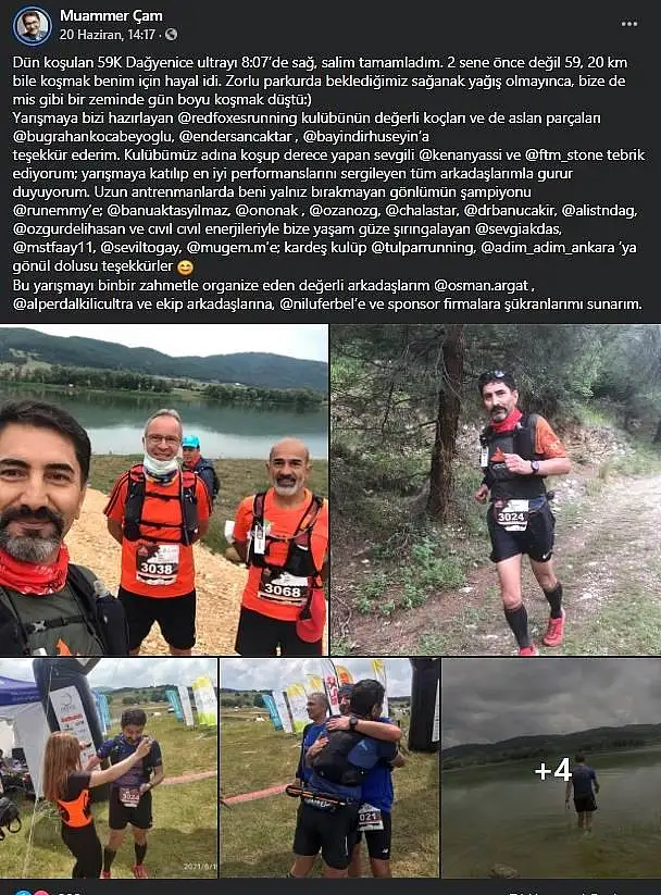 Öte yandan, sosyal paylaşım sitesinde 20 Haziran tarihinde paylaşım yapan Muammer Çam, "Dün koşulan 59K Dağyenice ultrayı 8:07’de sağ, salim tamamladım. 2 sene önce değil 59, 20 km bile koşmak benim için hayal idi. Zorlu parkurda beklediğimiz sağanak yağış olmayınca, bize de mis gibi bir zeminde gün boyu koşmak düştü:) ifadelerini kullanmıştı.