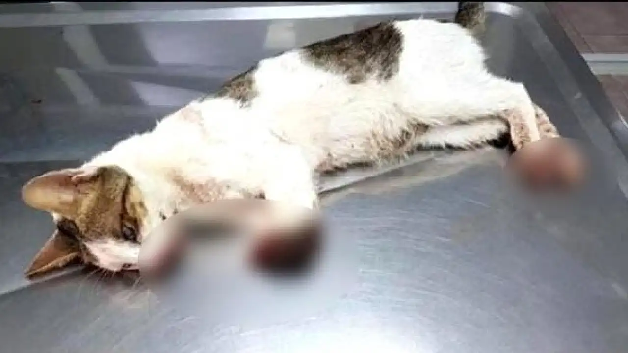 Kediye müdahale eden Veteriner Behçet Düzgün, "Bugün sabah saatlerinde bir bahçıvan yaralı kediyi getirdi. Yaptığımız incelemede kedinin genel durumu çok kötüydü. Kısırlaştırılmış erkek kedinin kanamasını durdurduk. Üç gün önce kesici satır, balta gibi bir aletle ön bacaklarının düzgün şekilde kesildiğini gördük. Çene kısmına sert bir cisimle vurulmuş. Yarasında kurtlanma oluşmuş. Bu yapılan bir vahşet. Tedavilere cevap vermeyen kediyi daha fazla acı çekmemesi için uyutmak zorunda kaldık" dedi.