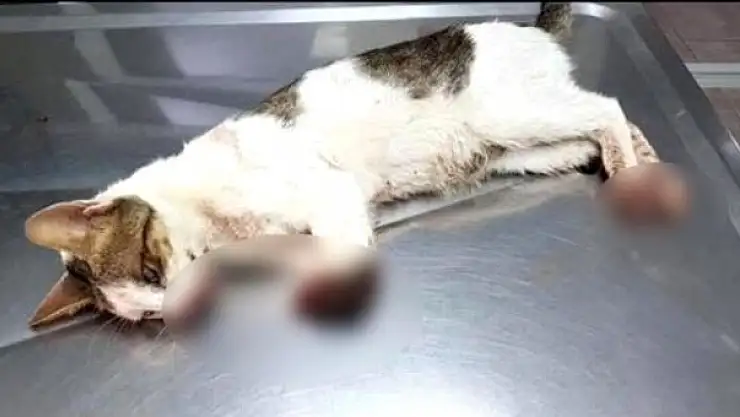 Muğla'nın Marmaris ilçesindeki bir sitenin bahçesinde ön bacakları diz altından kesilmiş olarak bulunan sokak kedisi götürüldüğü veterinerde uyutularak tedavi altına alındı.