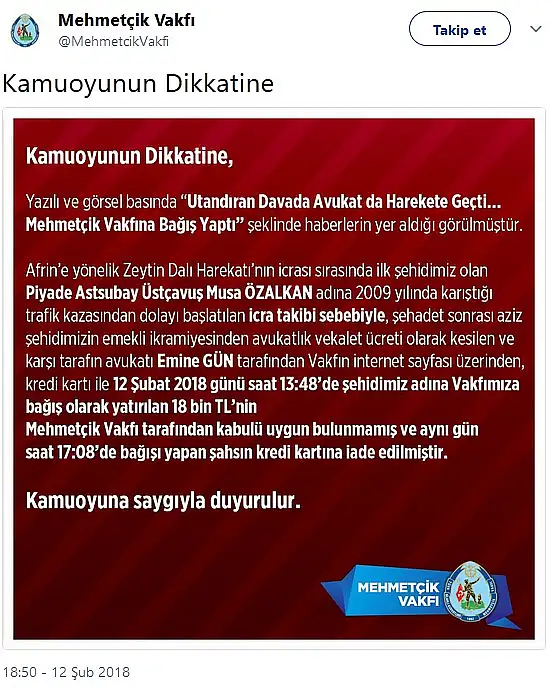 Şehidin arabasına ve emekli ikramiyesine haciz koyduran karşı tarafından avukatı Emine Gün, daha sonra Mehmetçik Vakfı’nın internet sayfası üzerinden kredi kartı ile şehit Musa Özalkan’ın adına 18 bin TL’lik bağış yaptı. Konuyla ilgili açıklama yapan Mehmetçik Vakfı da, şehit Özalkan’ın ikramiyesine haciz getiren karşı tarafın avukatı Emine Gün’ün bu bağışını aynı gün geri çevirdiğini açıkladı.