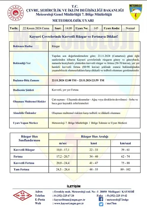 Meteoroloji 7.Bölge Müdürlüğü, Kayseri genelinde 23 Kasım Cumartesi günü kuvvetli rüzgar ve fırtına beklendiğini duyurarak olumsuzluklara karşı tedbirli olunmasını istedi.