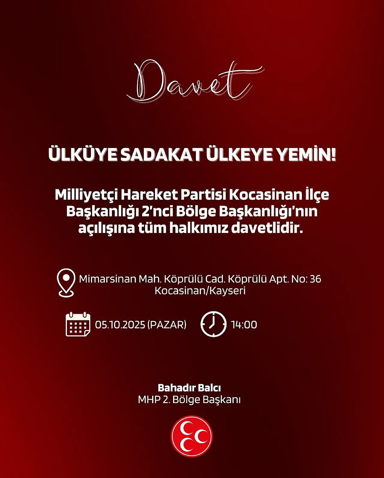 MHP 2’nci Bölge Başkanı Bahadır Balcı, tüm vatandaşları açılış programına davet etti.