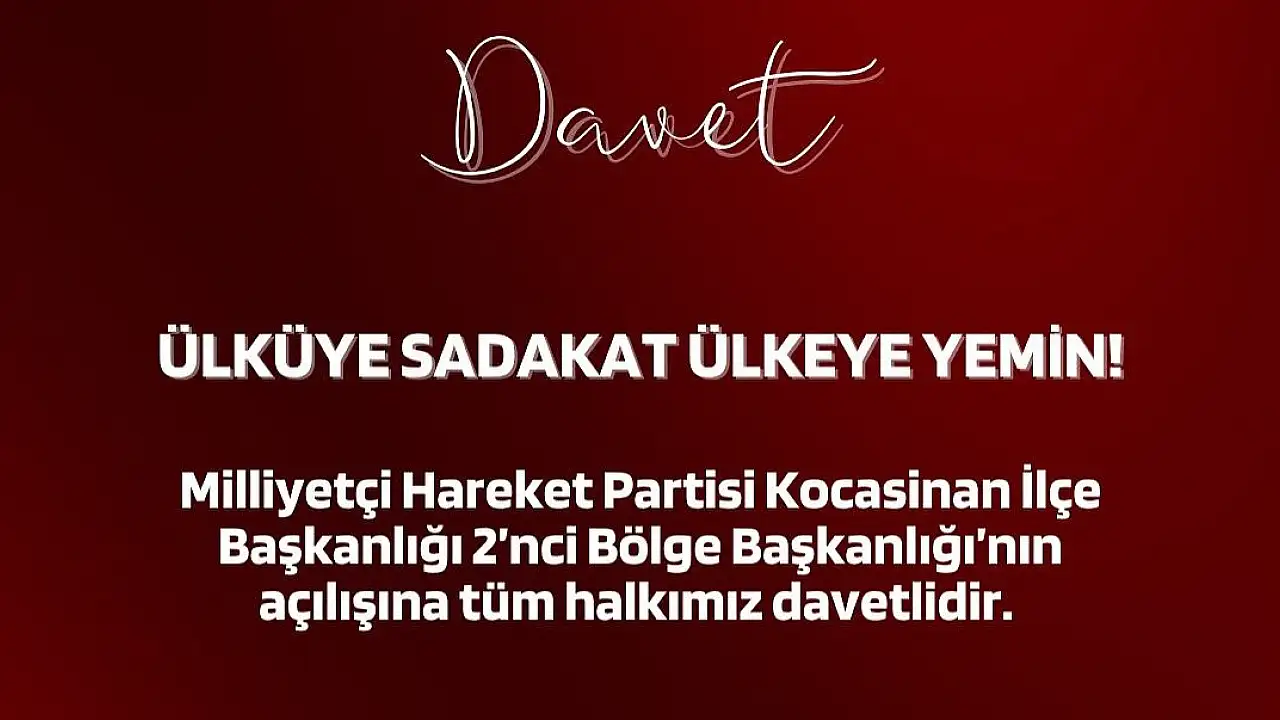 Milliyetçi Hareket Partisi Kocasinan İlçe Başkanlığı 2'nci Bölge Başkanlığı 5 Ekim Pazar günü Mimarsinan mahallesinde açılacak.