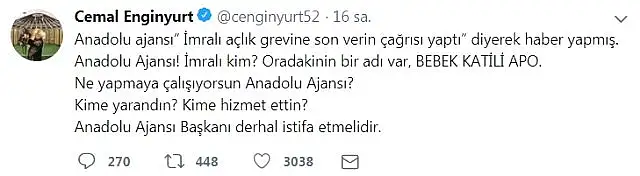 MHP Ordu Milletvekili Cemal Enginyurt, sosyal medya hesabından yaptığı bir paylaşımla "İmralı'dan 'açlık grevlerine son verin' çağrısı" haberindeki ifadeler nedeniyle Anadolu Ajansı Başkanı'na istifa çağrısı yaptı.