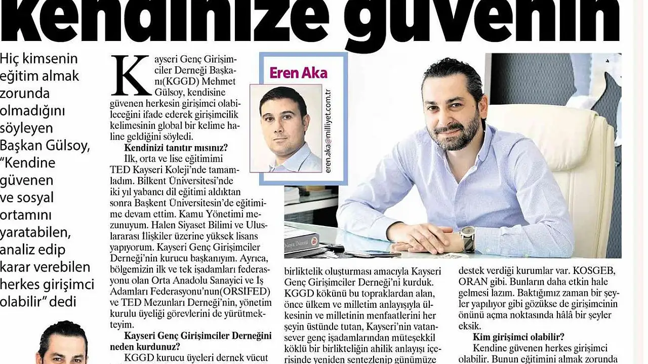 Kayseri Genç Girişimciler Derneği Başkanı Mehmet Gülsoy, kendisine güvenen herkesin girişimci olabileceğini ifade ederek girişimcilik kelimesinin global bir kelime haline geldiğini söyledi.Öncelikli bize kendinizi tanıtır mısınız? Mehmet Gülsoy: 22 Eylül
