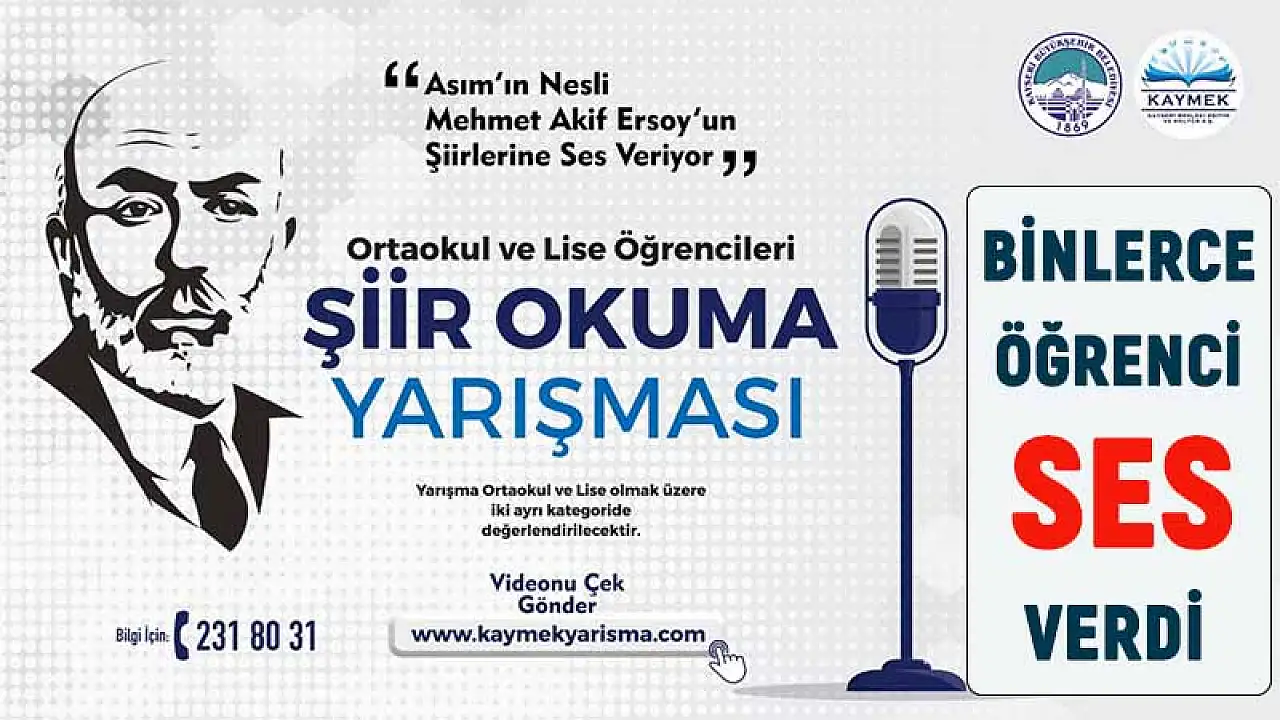 Kayseri Büyükşehir Belediyesi bünyesindeki KAYMEK A.Ş. tarafından düzenlenen ‘Asım’ın Nesli, Akif’in Şiirlerine Ses Veriyor’ Şiir Okuma Yarışması’na 777 ortaokul öğrencisi, 238 lise öğrencisi olmak üzere toplam bin 15 öğrenci katıldı.