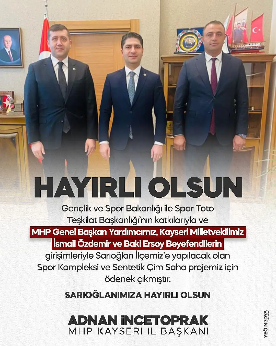 Milliyetçi Hareket Partisi Genel Başkan Yardımcısı ve Kayseri Milletvekili İsmail Özdemir ve Milliyetçi Hareket Partisi Kayseri Milletvekili Baki Ersoy’un girişimleri sonucu Sarıoğlan’a spor kompleksi ve sentetik çim saha yapımı projesine ödenek çıktı.