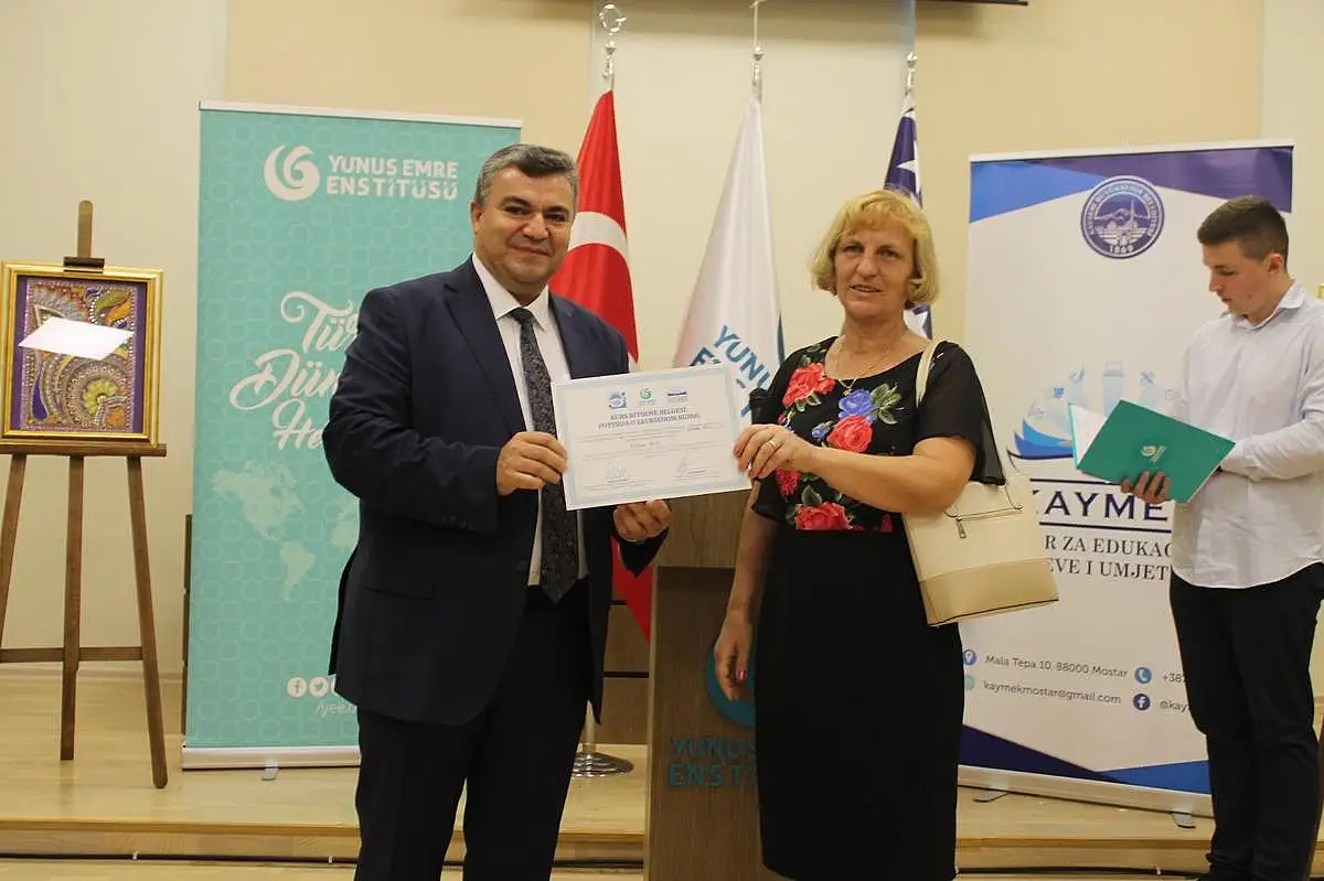 Türkiye Cumhuriyeti Mostar Başkonsolosu Yaşar Ergün ise yaptığı konuşmada, “Aynı din, aynı kültür ve aynı tarih ortaklığı içinde, geleceğe de aynı umutlarla bakan iki toplumun kadim iki şehri arasındaki ilişki elbette sıradan bir protokolü aşan değere sahiptir” diyerek, dost ve kardeş şehir Mostar’a bugüne kadar yaptığı maddi ve manevi yardımlardan dolayı Kayseri Büyükşehir Belediyesi’ne ve personeline teşekkür etti. KAYMEK, yoğun ilgiyle karşılanan yılsonu sergisini ziyarete açarken, Büyükşehir Belediyesi Genel Sekreter Yardımcısı Serdar Öztürk ve diğer davetlilerin de takdimi ile kurslarını başarı ile bitiren kursiyerlere sertifikalarını dağıttı.