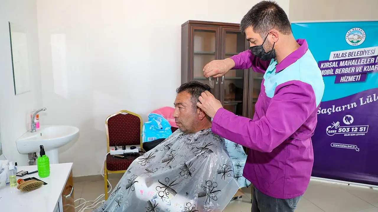 Talas Belediye Başkanı Mustafa Yalçın tarafından başlatılan kırsal mahallelere yönelik mobil berber ve kuaför hizmeti devam ediyor.Başta hasta, yaşlı, engelli ve ihtiyaç sahibi vatandaşlar olmak üzere talepte bulunan mahalle sakinlerinin tıraş ve saç bakı