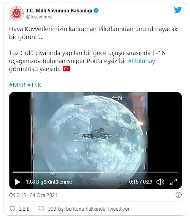Milli Savunma Bakanlığı'nın Twitter hesabından yapılan paylaşımda, "Hava Kuvvetlerimizin kahraman pilotlarından unutulmayacak bir görüntü. Tuz Gölü civarında yapılan bir gece uçuşu sırasında F-16 uçağımızda bulunan Sniper Pod'a eşsiz bir dolunay görüntüsü yansıdı" ifadelerine yer verildi.