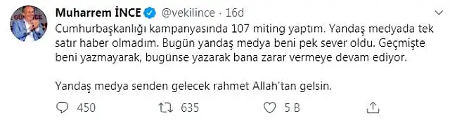 Cumhurbaşkanı adayı olduğu dönemde yaptığı mitinglerin haber yapılmadığını dile getiren İnce, son dönemdeki tartışmalar için "Yandaş medya beni pek sever oldu" dedi. Bugün haber yaparak kendisine zarar verdiklerini dile getirdiği bazı yayın organlarını eleştiren İnce, "Yandaş medya senden gelecek rahmet Allah'tan gelsin" dedi.