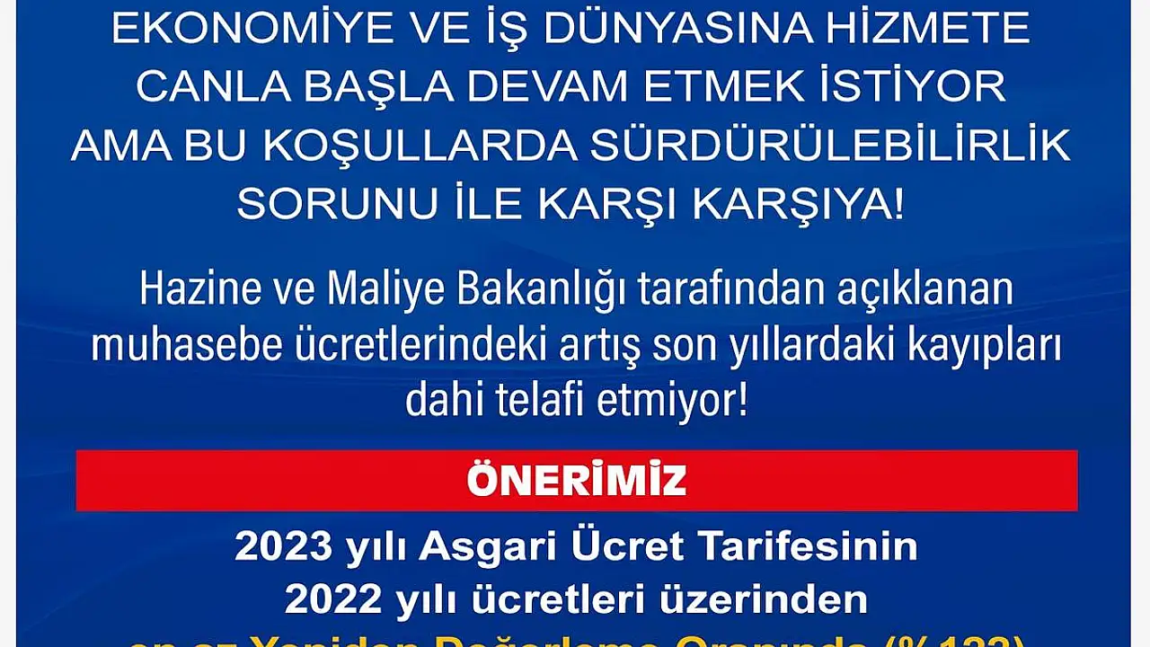 Hazine ve Maliye Bakanlığı tarafından açıklanan muhasebe ücretlerindeki yüzde 85 artış, kayıpları dahi telafi etmiyor. 2023 yılı Serbest Muhasebecilik, Serbest Muhasebeci Mali Müşavirlik ve Yeminli Mali Müşavirlik Asgari Ücret Tarifesinin 2022 yılı için yayınlanan asgari ücret tarifesindeki tutarların en az yeniden değerleme oranı olan yüzde 122 oranında artırılarak uygulanması gerekmektedir.