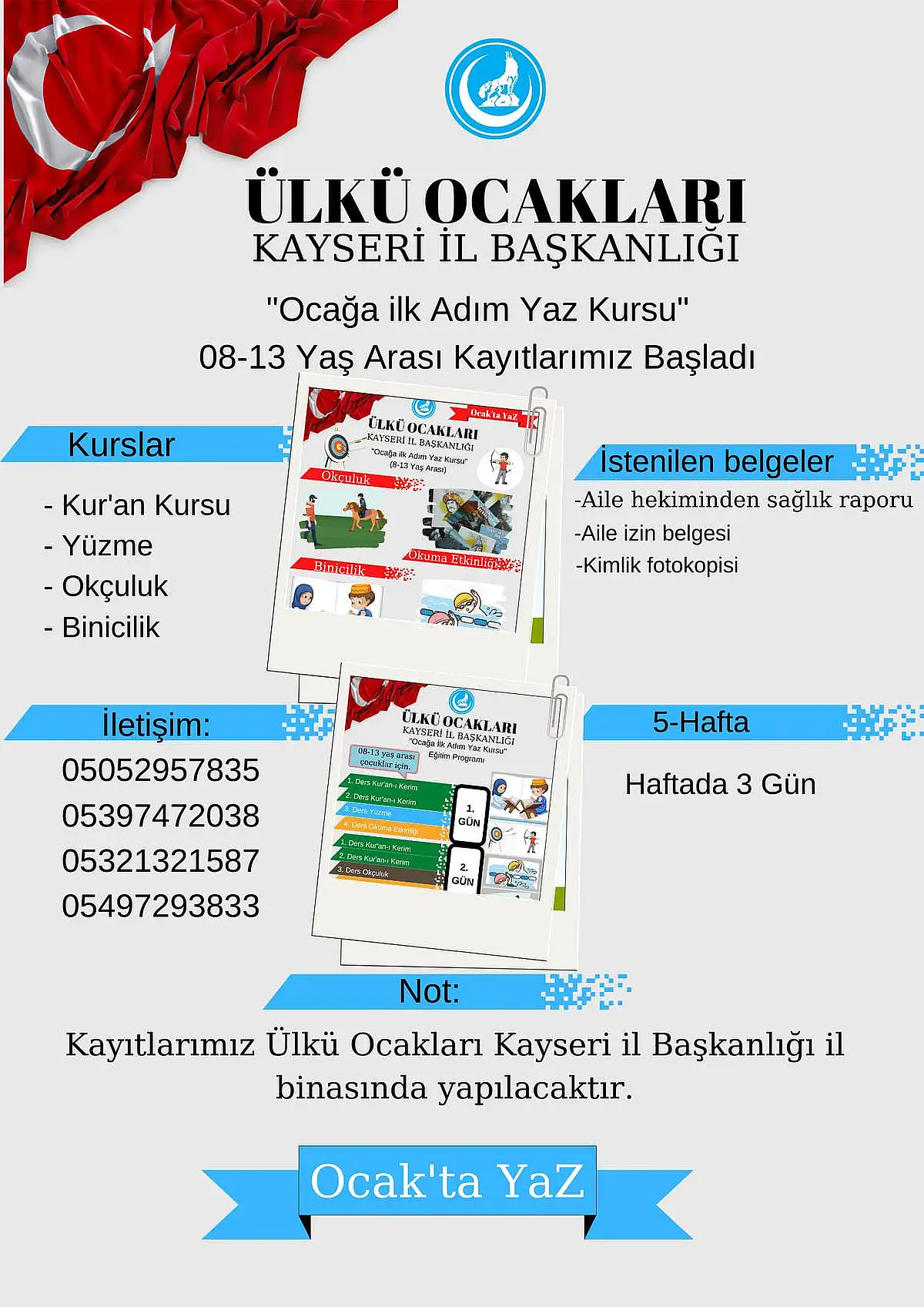 Ülkü Ocakları Kayseri il Başkanlığı, 8-13 yaş arası çocuklar için yaz kursu düzenliyor. ‘Ocağa İlk Adım Yaz Kursu’nda çocukların dini, fiziksel ve zihinsel gelişimleri hedefleniyor. Ülkü Ocakları Kayseri İL Başkanlığı’nda kayıtların yapılacağı kursun içeriğini ise Kur'an-ı Kerim Kursu, Binicilik Kursu, Yüzme Kursu, Okçuluk Kursu, Okuma Etkinliği oluşturuyor.
