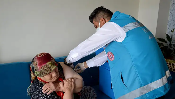 OĞLUNUN İKNA ETTİĞİ 91 YAŞINDAKİ RAZİYE NİNE COVİD-19 AŞISINI EVİNDE OLDU