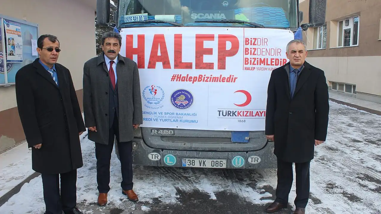 KYK'nın Kayseri'de bulunan 8 yurdunda kalan 6 bin öğrencinin, 'Halep bizdir, Halep bizdendir, Halep bizimledir' yardım kampanyası çerçevesinde topladıkları malzemeler, düzenlenen tören ile Halep'e uğurlandı. Yardım kampanyası hakkında bilgiler veren KYK İl Müdürü Sakin Terzi, öğrenciler ile gurur duyduğunu söyledi. Terzi, "Kredi Yurtlar Genel Müdürlüğü ve Kızılayın ortak programı olarak yurtlarımızda kalan öğrencilerimizde bir farkındalık yaratmak amacıyla düzenlediğimiz 'Halep bizdir, Halep bizdendir, Halep bizimledir' yardım kampanyası adı altında yurtlarımızda kalan öğrenciler önce kendi imkanları ile cep harçlıklarından biriktirdikleri paralar ile, daha sonrada bir komitede grup olup Kayserili hayırseverlere giderek yapmış oldukları yardımlarla beraber 25 ton civarında malzemeyi 1 TIR ile beraber Halep'teki kardeşlerimize göndermek için yola çıkacaktır. Ben buradan öğrencilerimize teşekkür ediyorum" ifadelerini kullandı.